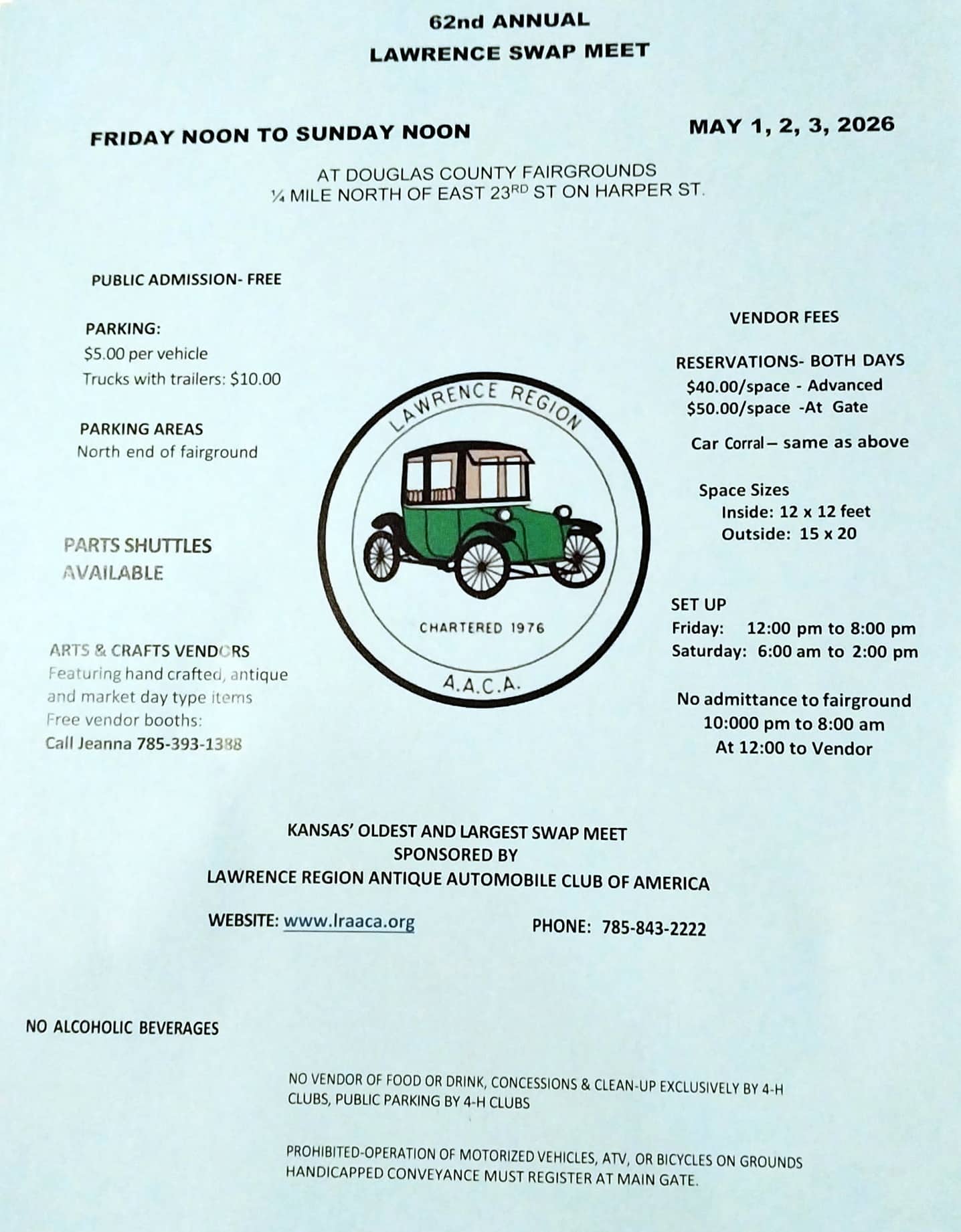 Lawrence KS, May 1-3, 2026. Annual AACA Swap Meet. Douglas County